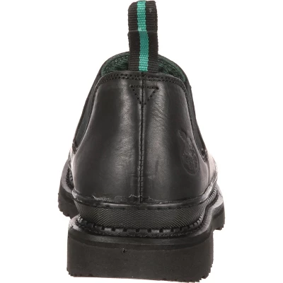 These black Georgia Giant Romeo Work Shoes have been crafted with full-grain leather that’s durable and soft. There’s a bumper guard just above the work shoes’ round toe that helps protect this footwear against abrasions and exposure to oil. The pull loops are strong and make it easy to get into the work shoes.Whether you’re wearing these romeo shoes to work or casually around town on a hot summer day, your feet remain dry because the men’s shoes have been made with a high-performance lining. Your feet will be comfortable on the footwear’s EVA midsole; its cushioning feels great and helps alleviate the weight you put on your feet. To make the structure sound and durable, the work shoes have Goodyear® welt construction.A steel shank has been incorporated into the comfortable work shoes for steady footing; it supports your foot arch and it gives the footwear more stability. The Georgia Giant polyurethane outsole is cushioning and flexible; plus, its resistance to oil, abrasions and chemicals allows it to be highly durable.Have you been wanting a pair of men’s comfortable shoes that you can wear to work? If so, these Georgia Giant Romeo Work Shoes are perfect for you!