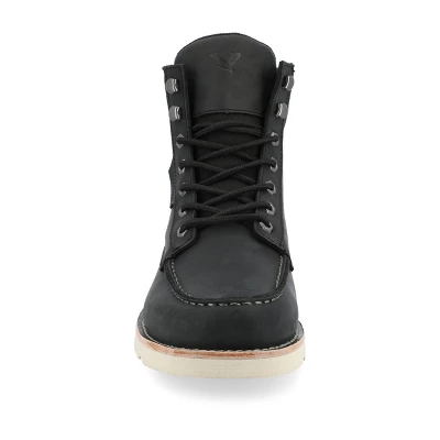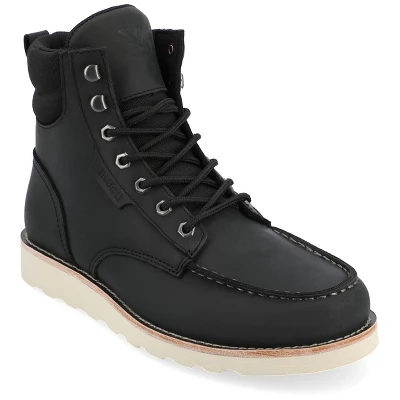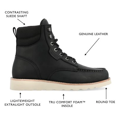 Get ready to venture into the wild with Venture by Territory, the rugged ankle boot that combines style and durability. Crafted with water-resistant genuine leather and featuring a two-tone design, Venture is both fashionable and practical. The lace-up and moc toe design ensure a secure fit, while the 1 1/4-inch EVA sole provides traction and comfort. With its 6 mm Tru Comfort Foamâ„¢ insole, Venture offers superior cushioning and support, making it the perfect companion.